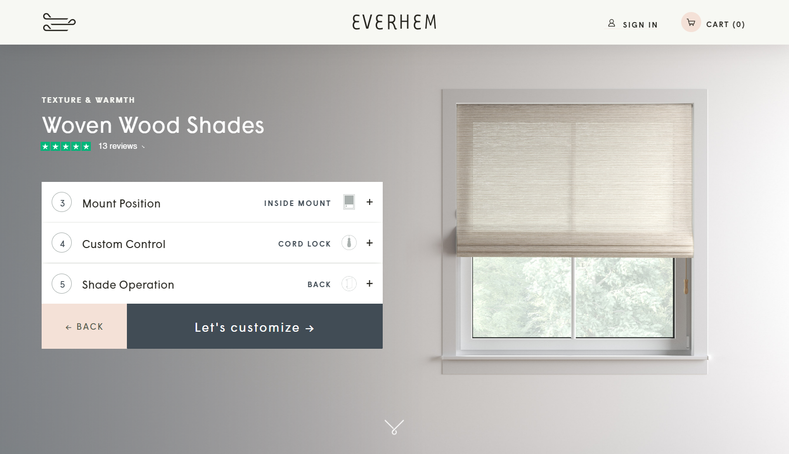 The user flow that Adam Weidenbaum created for window shade company Everhem guides users through the process of choosing a window shade and then customizing it to their needs. Adam broke this long flow into smaller chunks of three steps, then simplified the visuals further by putting collapsible sections in the hands of users.