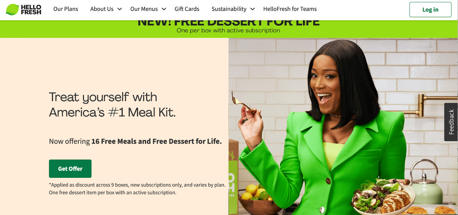 HelloFresh's landing page for their meal kit delivery service focuses on convenience and quality. The page features mouth-watering imagery of delicious meals along with clear messaging highlighting the benefits of subscribing to HelloFresh. The option to choose a meal plan and sign up for delivery encourages visitors to take action and start enjoying fresh, home-cooked meals.