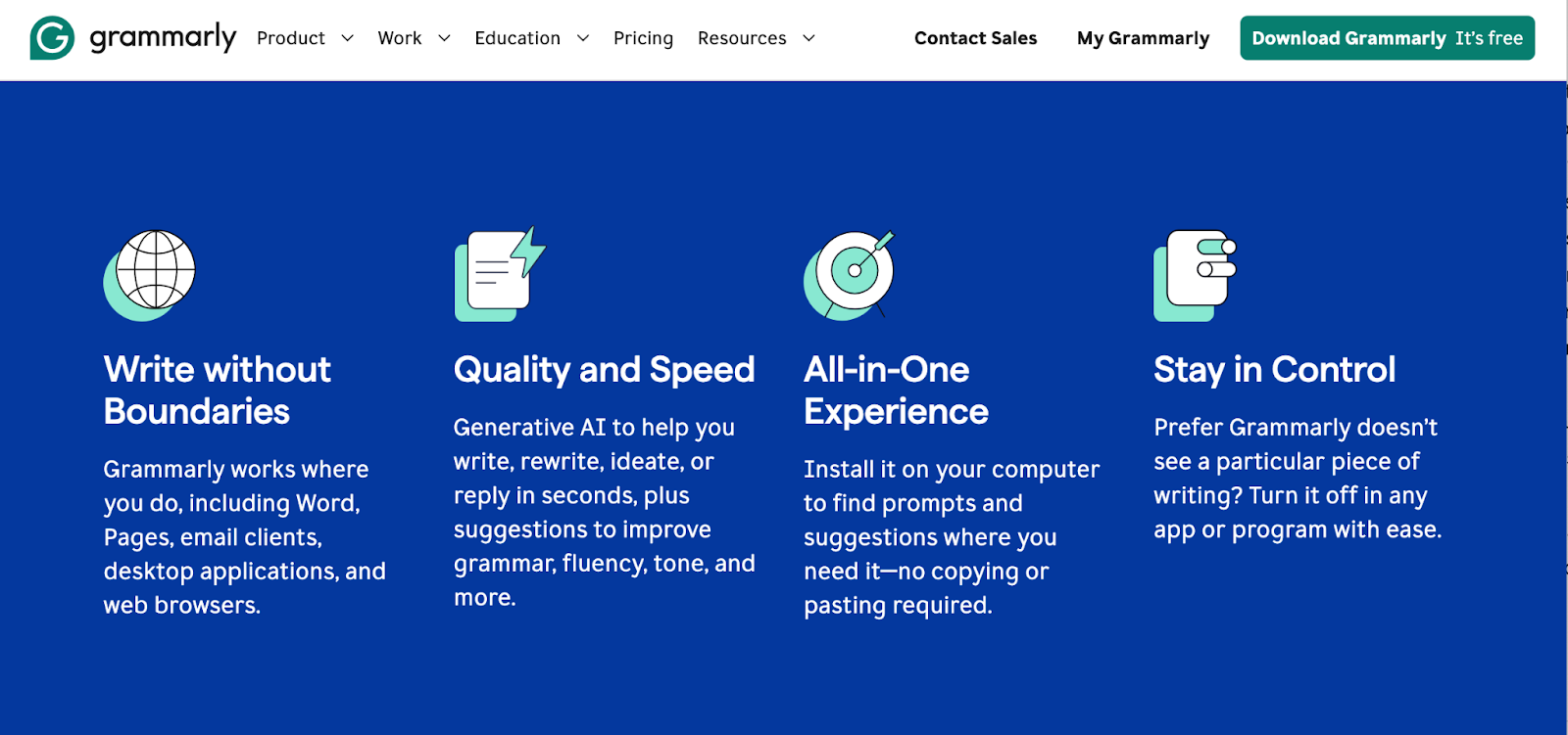 To explore the product even further, Grammarly artfully lists some of its core benefits using infographics and easy-to-read typography.