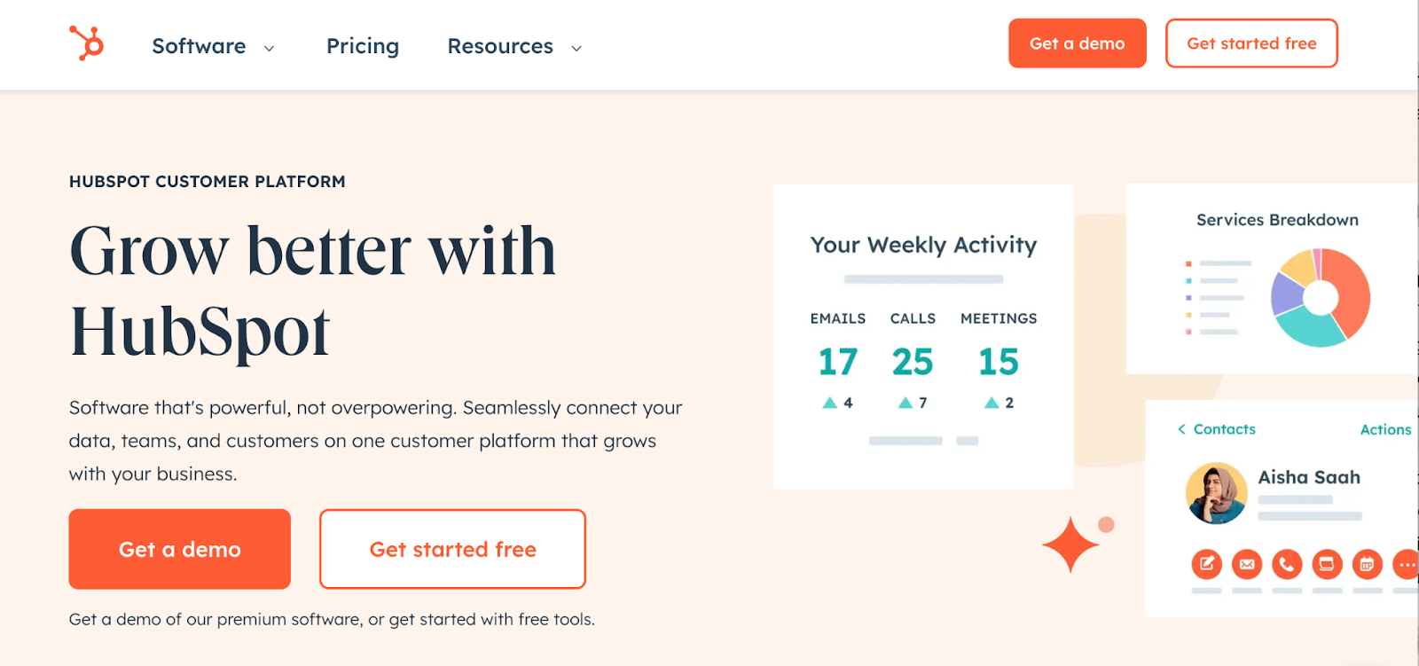 The landing pages greets visitors with a unique value proposition (connect data, teams, and customers with one platform that grows with you), as well as a free trial offer and an eye-catching CTA button to encourage visitors to explore the platform further through a demo.