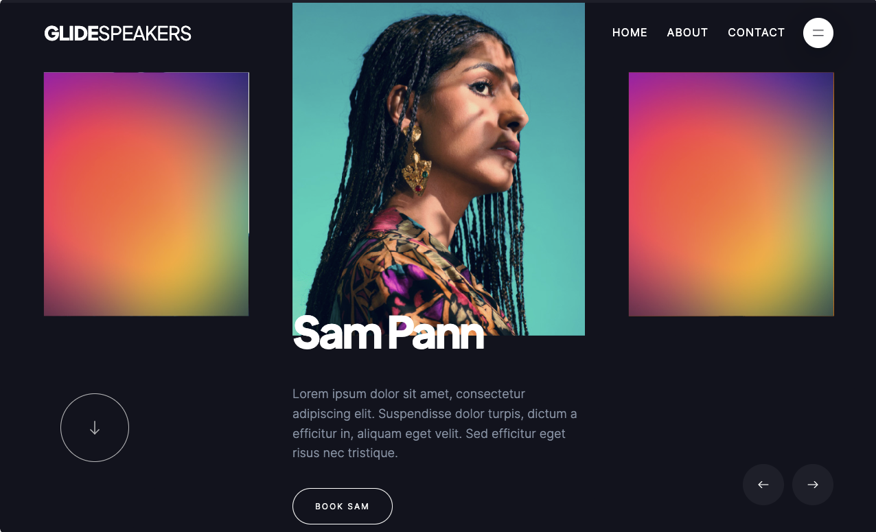 Ty Hughey’s Glidespeakers template is a conceptual page that advertises fictional speakers for hire. The site opens with a carousel describing these imaginary keynotes. As you scroll through the options, the site reveals the speaker’s portrait, name, and description — the rest of the carousel fades behind a rainbow gradient.