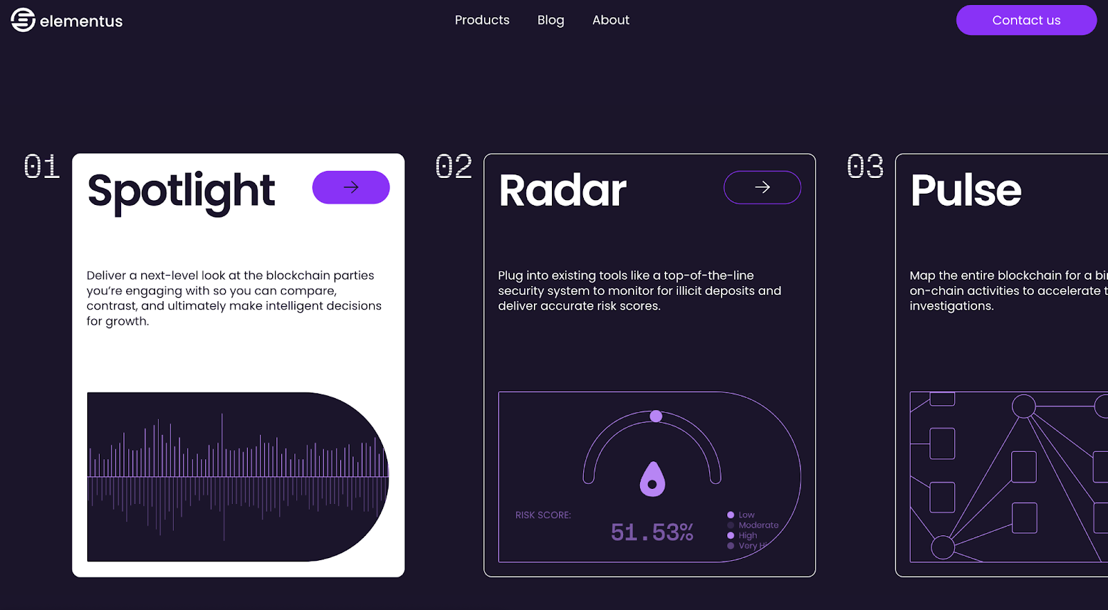 Designed by Paper Tiger, the website for Elementus has shades of purple, white, and gray. The user interface (UI) is split into multiple parts, like “Values,” “Products,” and “Solutions,” with the three colors alternating as each section’s background to distinguish them and increase readability.