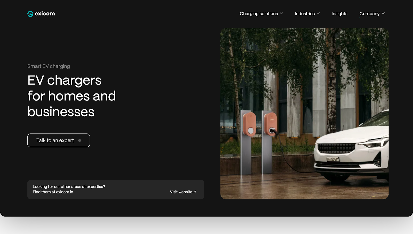 Exicom supplies smart electronic vehicle (EV) charging solutions for home and corporate use. This website, designed by Saddle, sports a lightweight design with a prominent hero image showcasing the company's products. Bold, clear headings, subheadings, and statistics help visitors understand Exicom's value proposition.