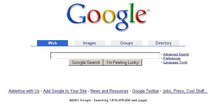 Harrington compares the overly complex UX of Google’s homepage circa 2001 — full of multiple tabs for web, image, group, or local searches — with its current, clean iteration with a very clear path towards entering a search query.