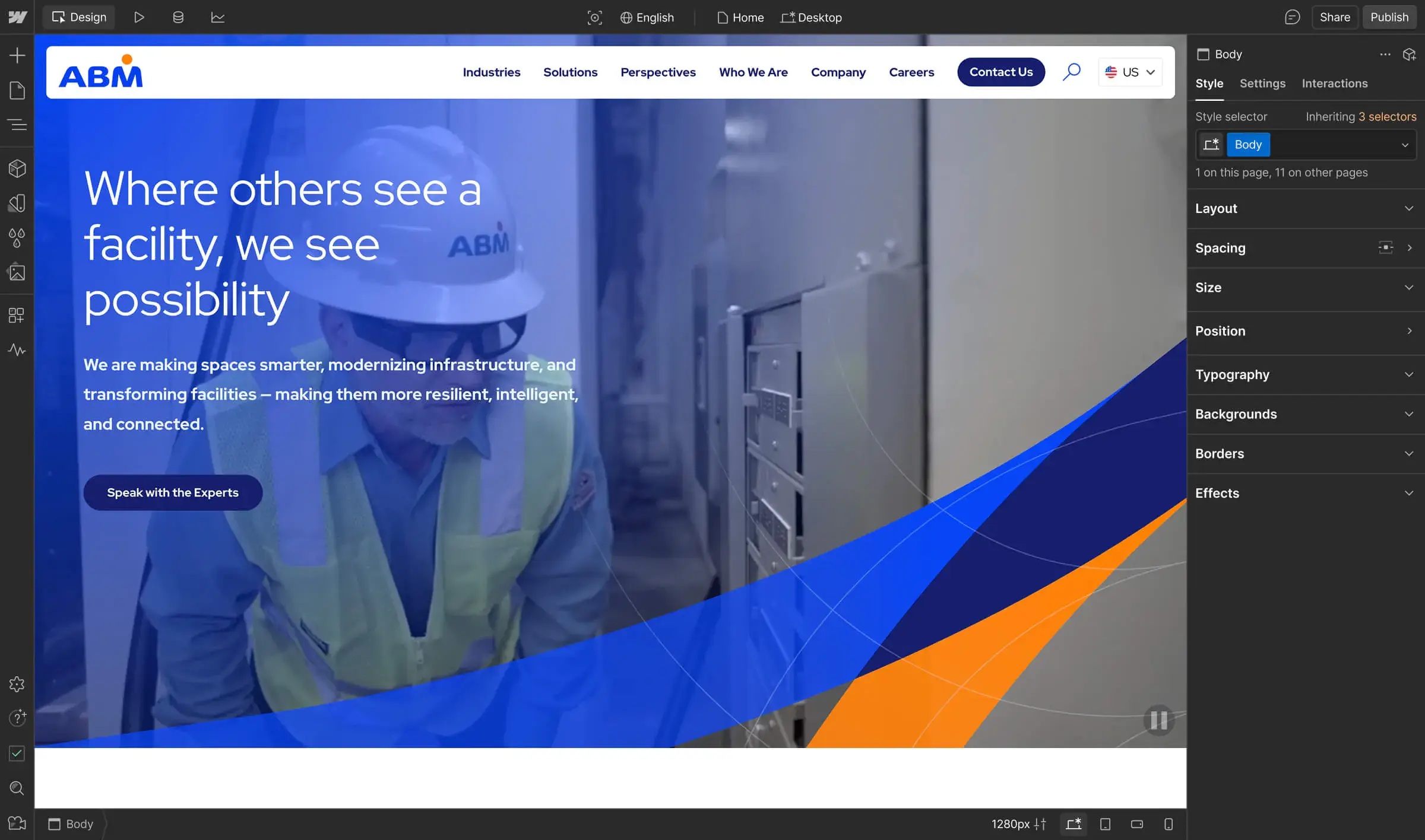 ABM’s newfound creative freedom even powered the launch of ABM Perspectives, a thought leadership hub designed to showcase the company’s innovation. “ABM Perspectives is a content hub where we serve up research, best practices, and innovation trends to establish confidence with our clients,” says Cary. Unlike the old days of burying SEO-rich content in PDFs, the team manages Perspectives entirely within Webflow’s CMS. Copywriters are inside the platform daily adding and styling content, updating assets, and optimizing for search.