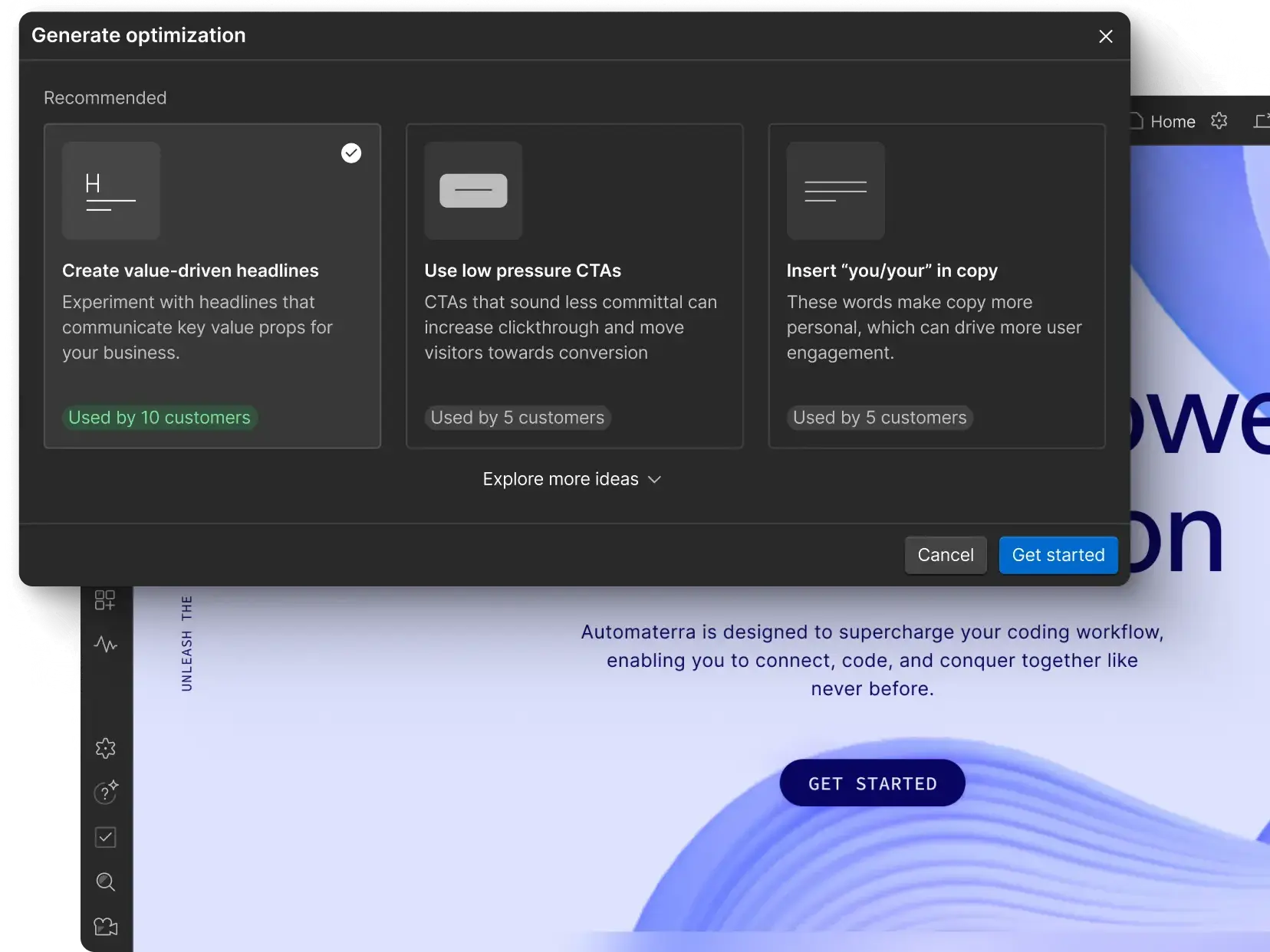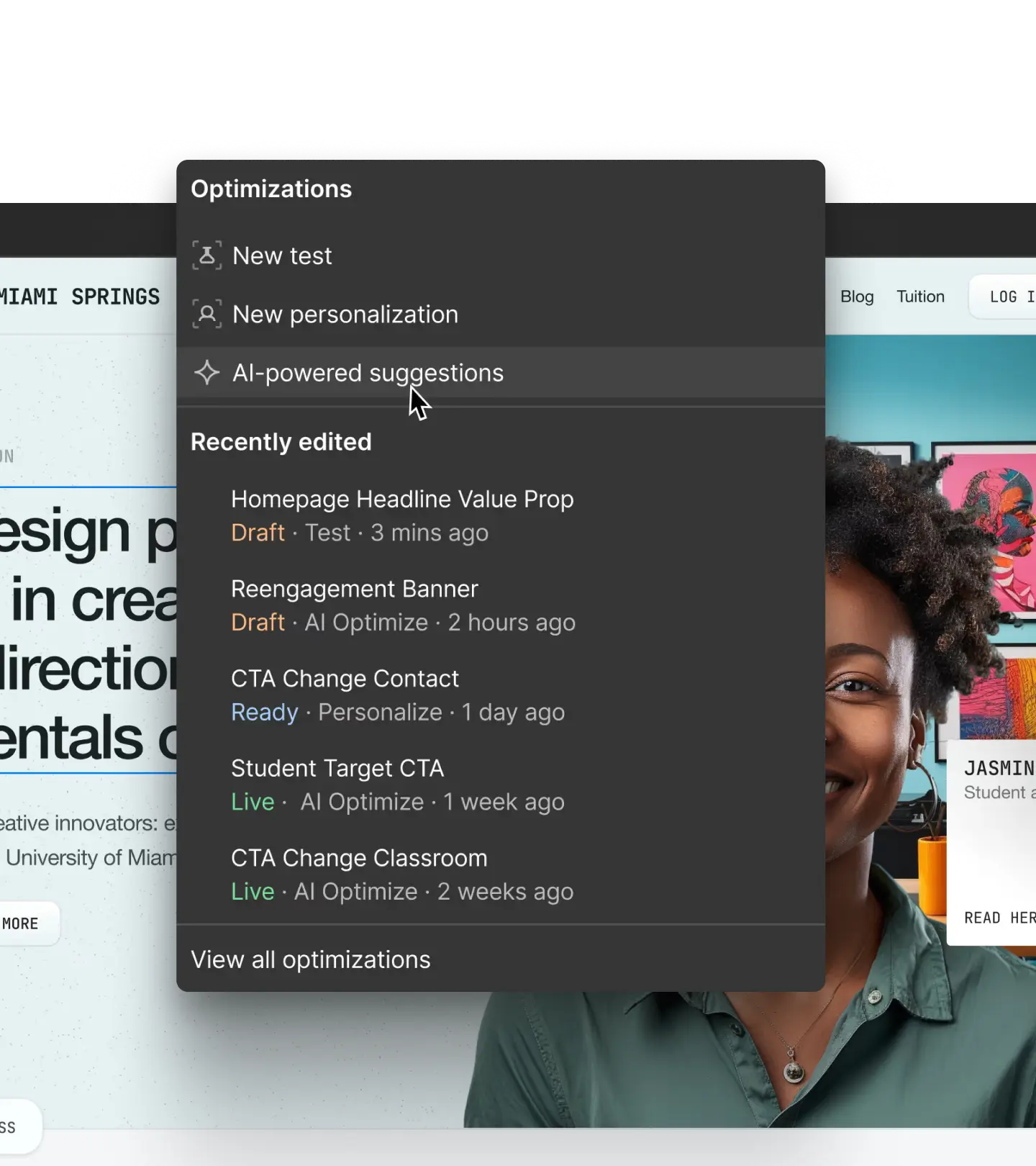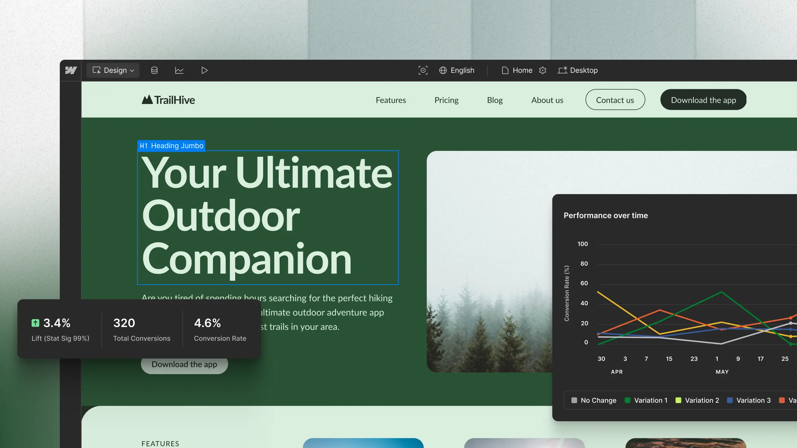 Optimize integrates directly with Webflow's visual development environment, allowing you to create and launch variations without developer dependencies or complex code implementations.
