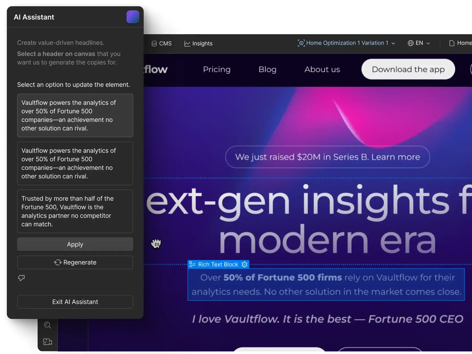 Unlike traditional tools that require you to choose between testing or personalization, Webflow Optimize leverages AI Assistant to dynamically show the right variation to the right audience without manual configuration.