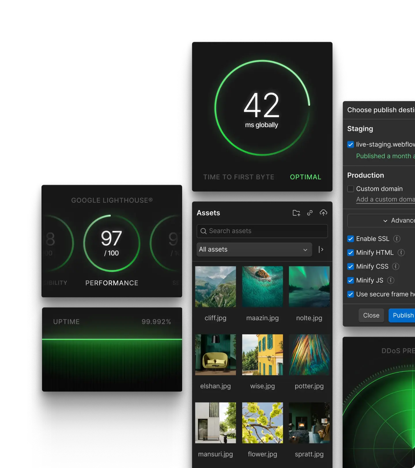 Webflow offers a fully-managed, auto-cached, instantly-deployed hosting environment that automatically serves your site from a location near each visitor. 15,000 websites are published with Webflow every hour with 99.99% hosting uptime, reaching 95% of the world in <50ms.