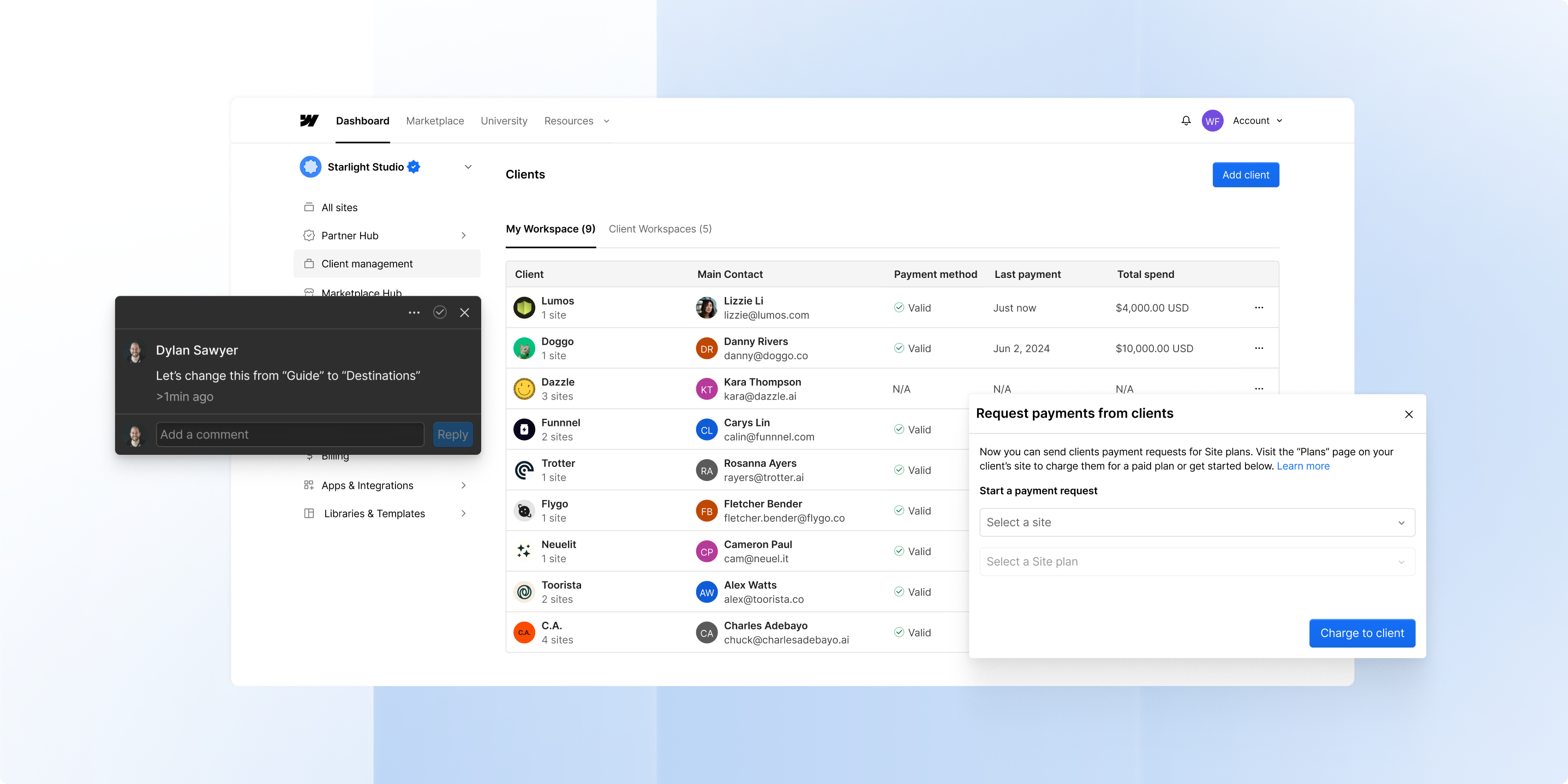 With features like client payments for centralizing billing, commenting for client feedback, and access to a thriving Partner ecosystem for growth opportunities, Webflow provides everything needed to run a successful freelance web design business.