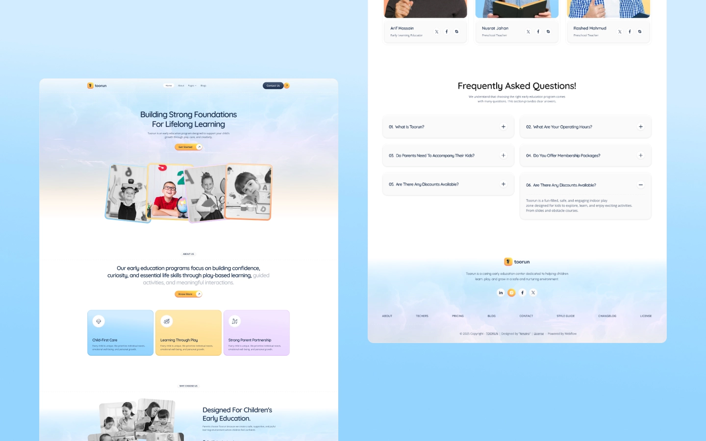 Toorun is an Early Education Webflow Template designed for preschools, kindergartens, and early learning centers. It features a child-focused design with CMS and E-commerce integration. Fully responsive and easy to customize.