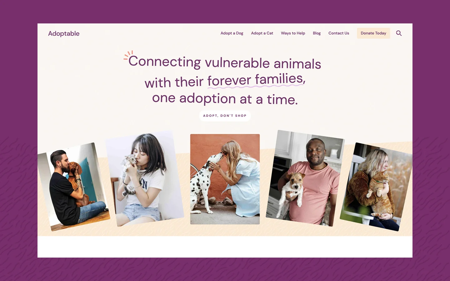Adoptable is a playful website template designed to help animal shelters put their best paw forward. Help your furry friends find their perfect match with fun profiles, useful filtering and e-commerce functionality to collect donations.