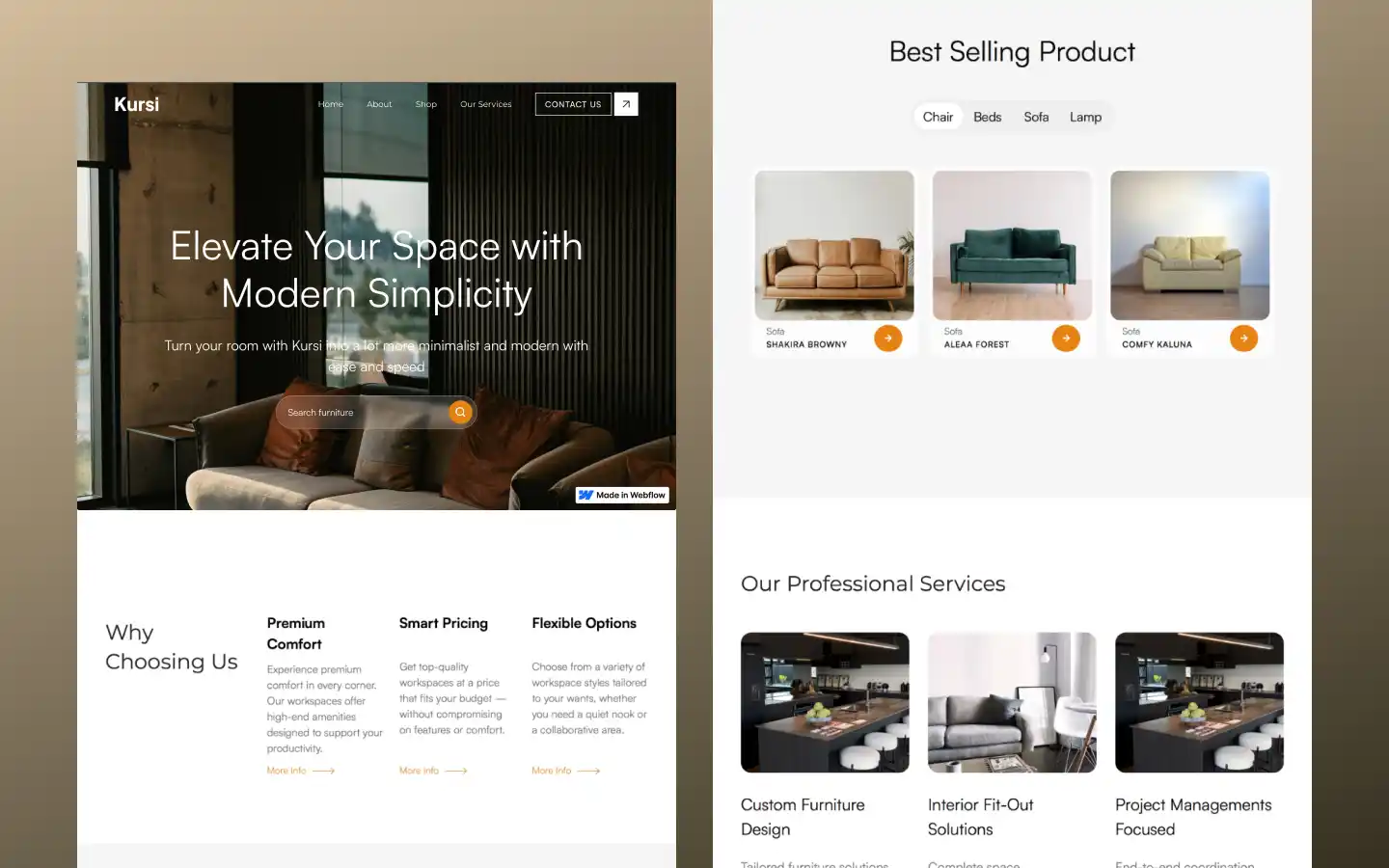 A modern and elegant furniture template designed to showcase chairs and home decor collections. Fully responsive, customizable, and perfect for e-commerce or portfolio displays