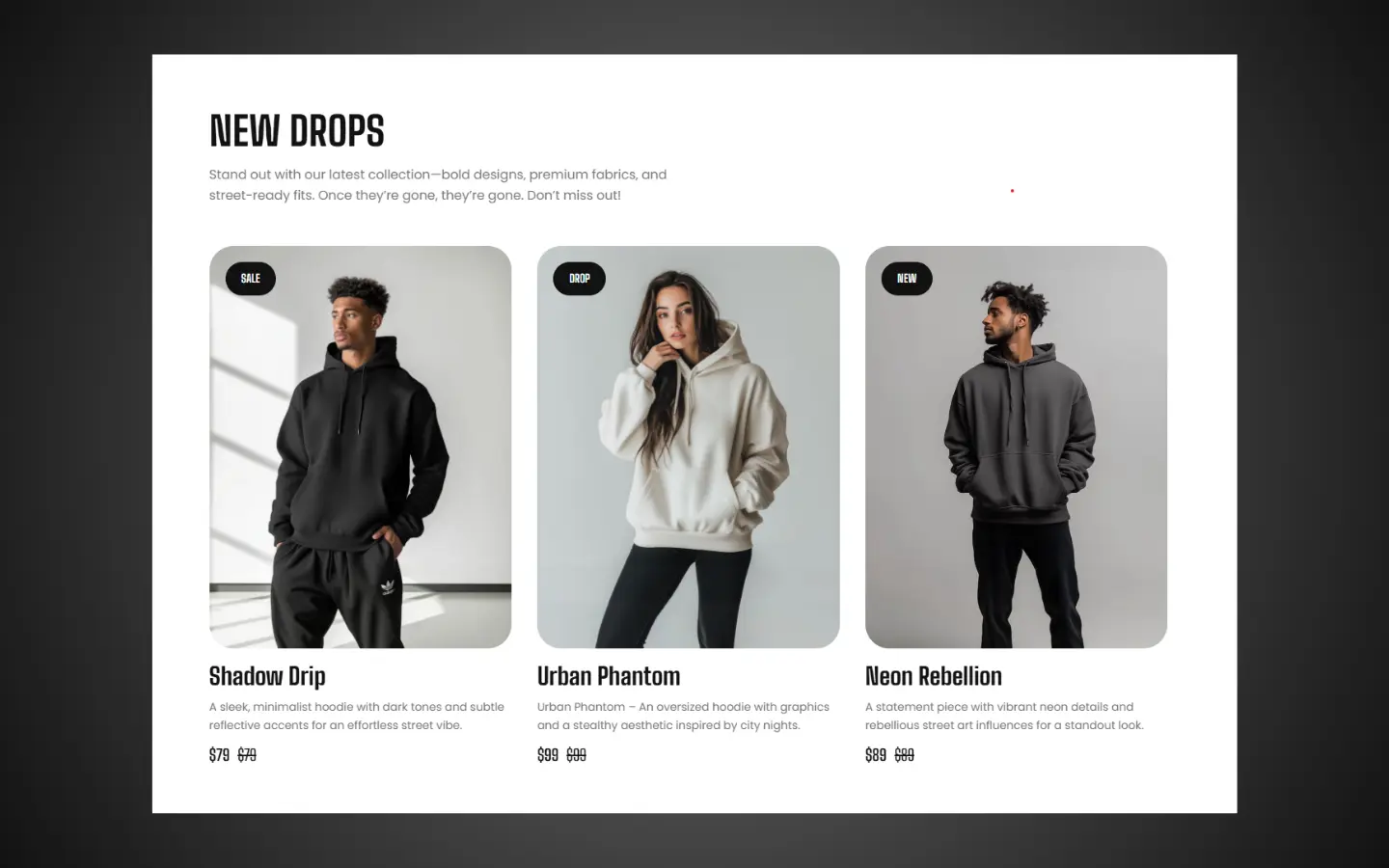 Velora is a modern streetwear website that blends minimal design with bold attitude. Featuring limited-edition drops, clean layouts, and striking visuals, it embodies the essence of urban fashion and lifestyle with effortless style.