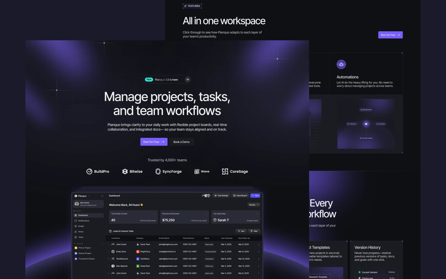 Planquo is a dark Webflow SaaS landing page template with feature highlights, download links, and contact forms, perfect for promoting productivity tools, project platforms, or AI-powered apps.