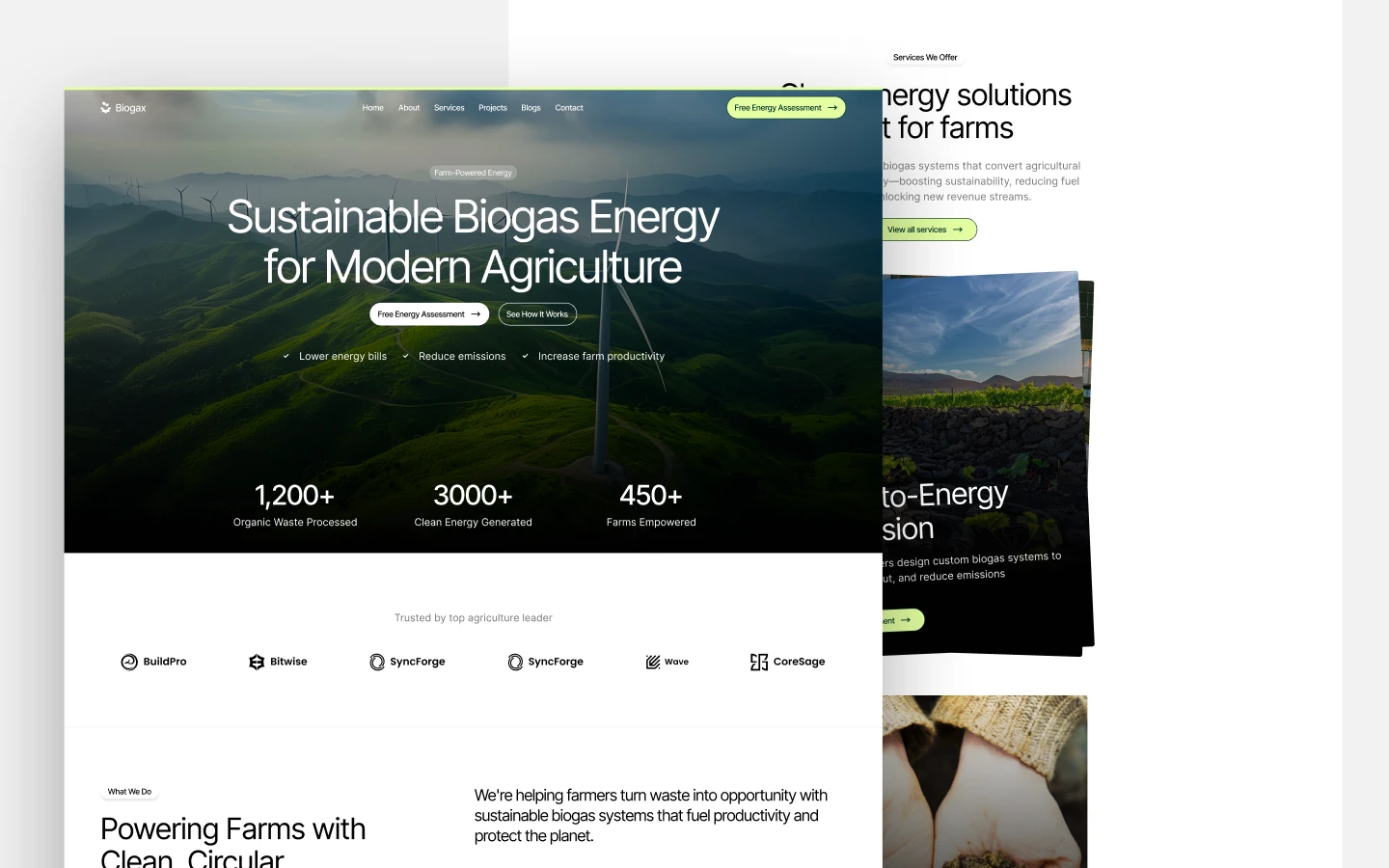 Biogax is a Webflow template for renewable energy and biogas companies. With service, project, and blog pages, it’s built to drive sustainability-focused leads and tell your impact story.