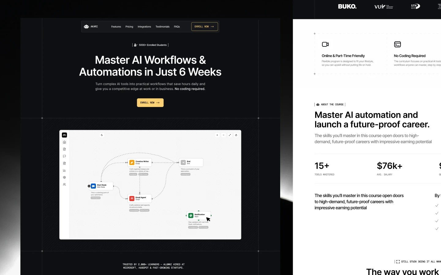 Akari is a sleek, single-page Webflow template built for AI course creators. Highlight your curriculum, benefits, pricing, and more, all in a high-converting layout designed to drive sign-ups and showcase your expertise.