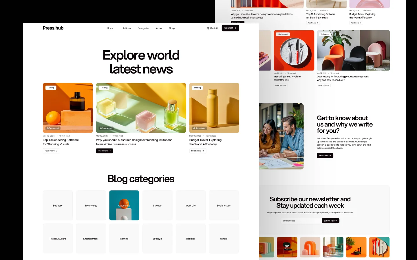 Press.hub is a sleek Webflow template for bloggers, featuring modern design, responsive layouts, and easy customization.