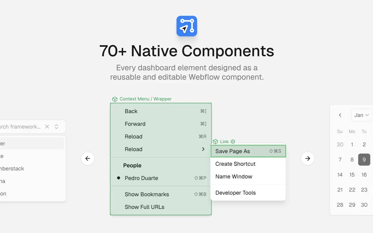 DashKit is a production-ready dashboard UI Kit that works seamlessly with App Gen — the only web application kit of its kind in Webflow. With 70+ native components, built-in Variants, Properties, Slots, Variables, and one-click dark.