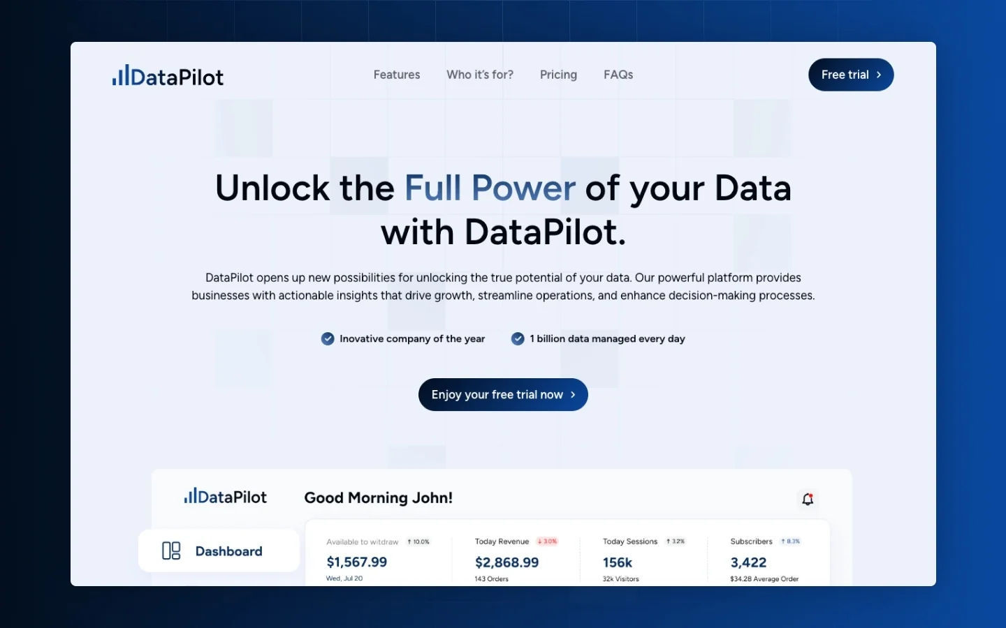 DataPilot – the ultimate SaaS template to boost conversions. With a modern, lead-generating design, it fits tech, finance, marketing, and more. Create an impactful, engaging landing page in just a few clicks!