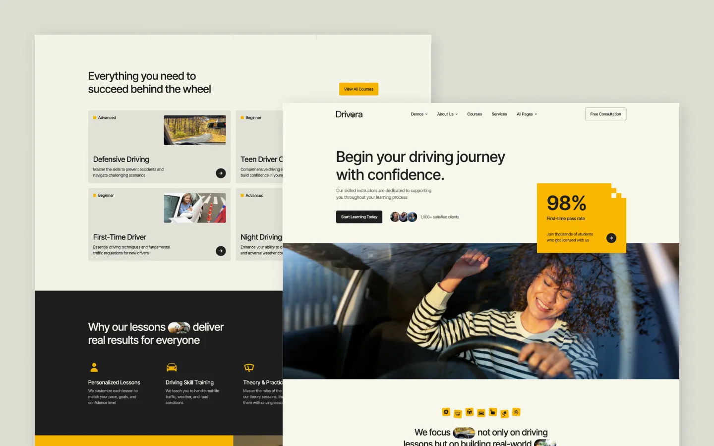 Drivora is a Webflow template for driving school, driving courses, learn to drive, driving lessons, driving instructor, beginner driving course, advanced driving course, defensive driving, driver education, driving license, road test preparation, driving classes, driving practice, automatic car lessons, manual car lessons, certified driving school, local driving school, online driving course, teen driving course, adult driving lessons, DMV test prep, behind the wheel training, driver safety course, affordable driving school, intensive driving course, traffic school, driving permit course, new driver training, professional driving school, student driver program websites.