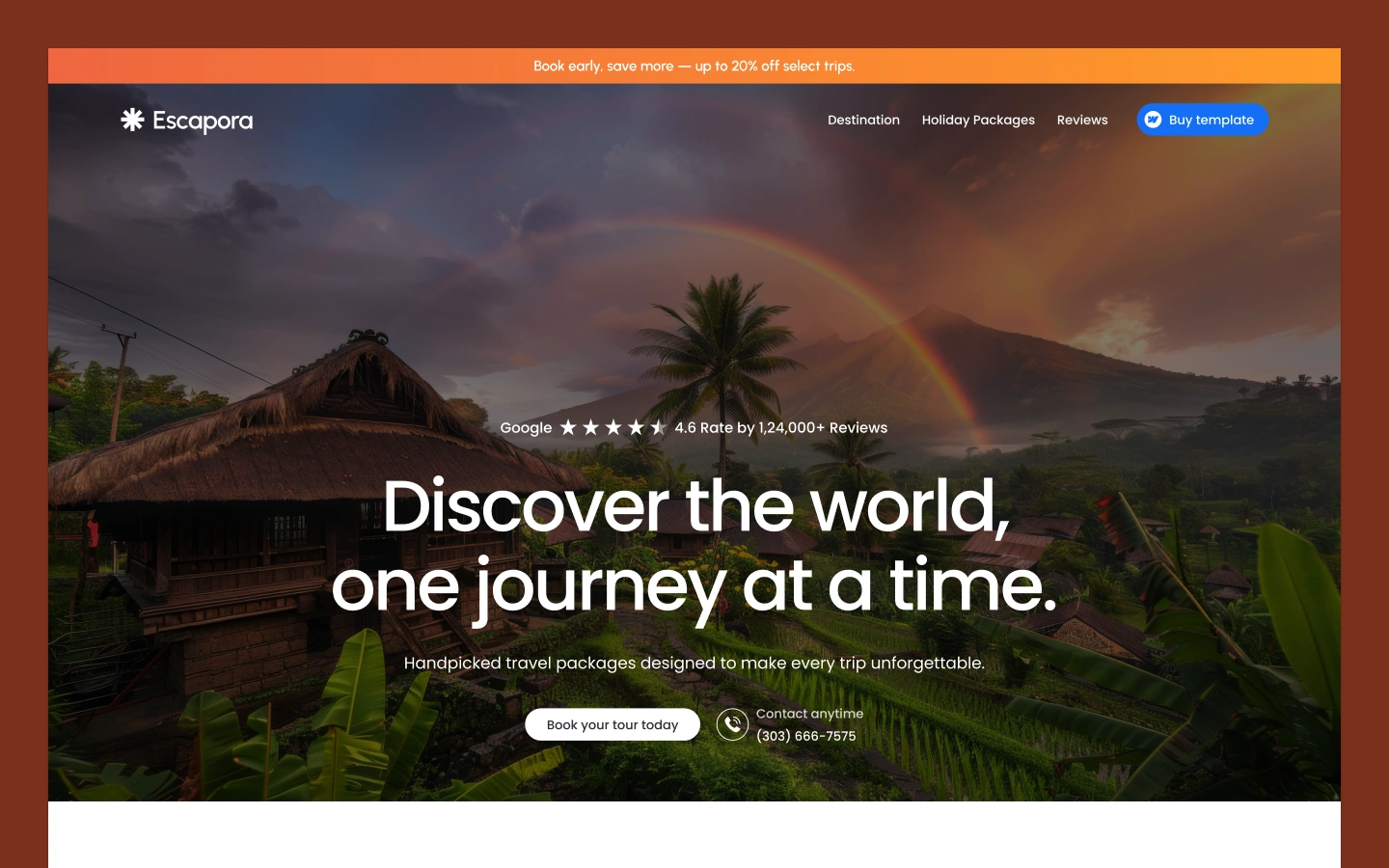 Escapora isn’t just a design—it’s a conversion-driven travel website template crafted to help agencies attract more clients. With its eye-catching visuals, user-friendly booking flow, and storytelling sections, you’ll have everything you need to build trust and drive more bookings without complex coding.