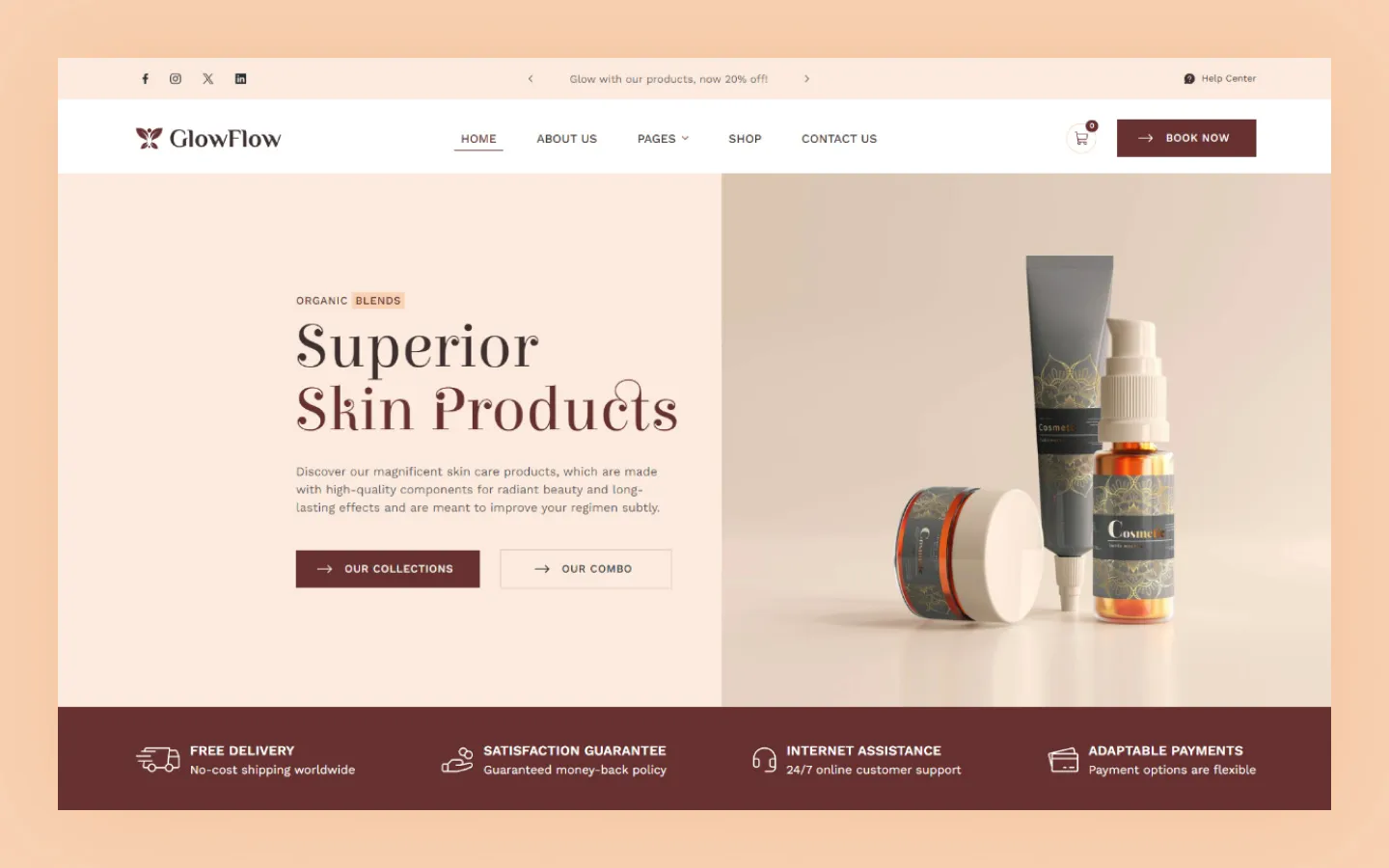 GlowFlow is a skincare Webflow template that suits skincare, spa, beauty, cosmetics, dermatologists, salons, therapists, facials, parlors, hair care, beauticians, toning, beauty shops, makeup, perfume, lotions, healthcare, organic cosmetics, creams, nail, massage, rejuvenation, health resorts, boutiques, makeup artist, barber, repair treatment, clinic, medical supplies, wellness, physiotherapy, and laser treatments websites.