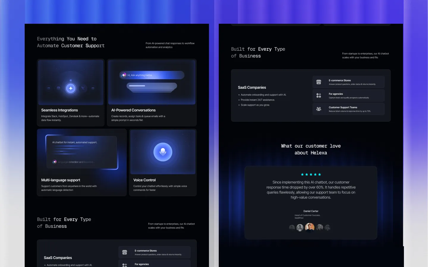 Helexa — SaaS Webflow Template built for modern AI helpdesk platforms that need clarity, speed, and conversion from the first scroll. Helexa is designed for AI-powered support tools, customer service SaaS, and automation platforms looking to present features, workflows, and value in a clean, structured way.