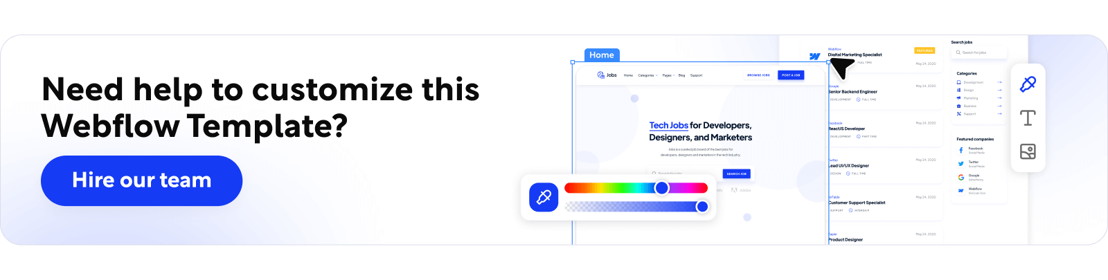 Jobs Webflow Template was developed to be easily editable, however, if you ever need help, find any issue, or just need us to give you a hand, we are always available to help you. Feel free to send us an email to jobs@brixtemplates.com — We will be happy to help you!