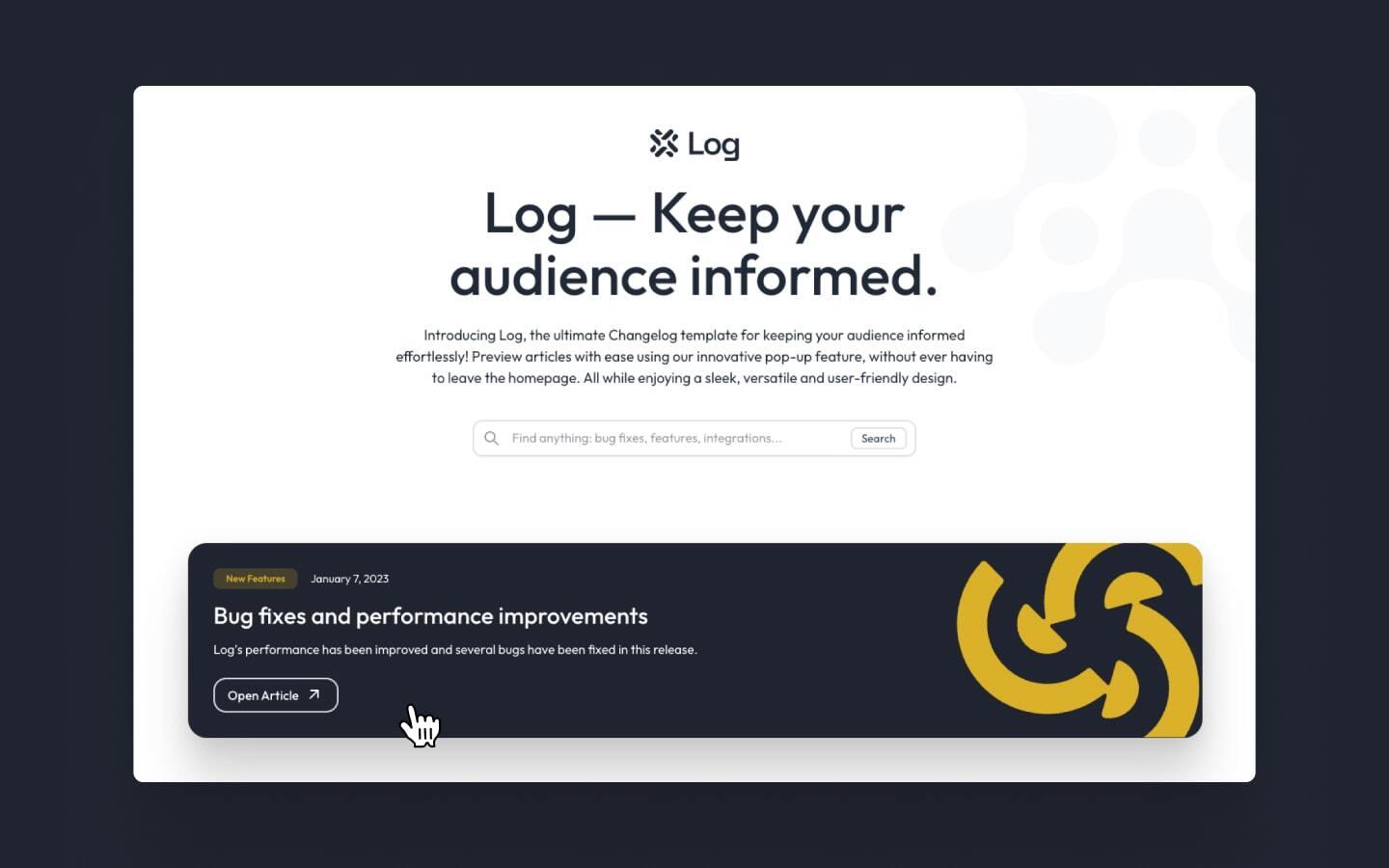 Introducing Log, the perfect one-page template for your changelog. With Log, you can easily share your articles with your readers in a clean and modern interface.
