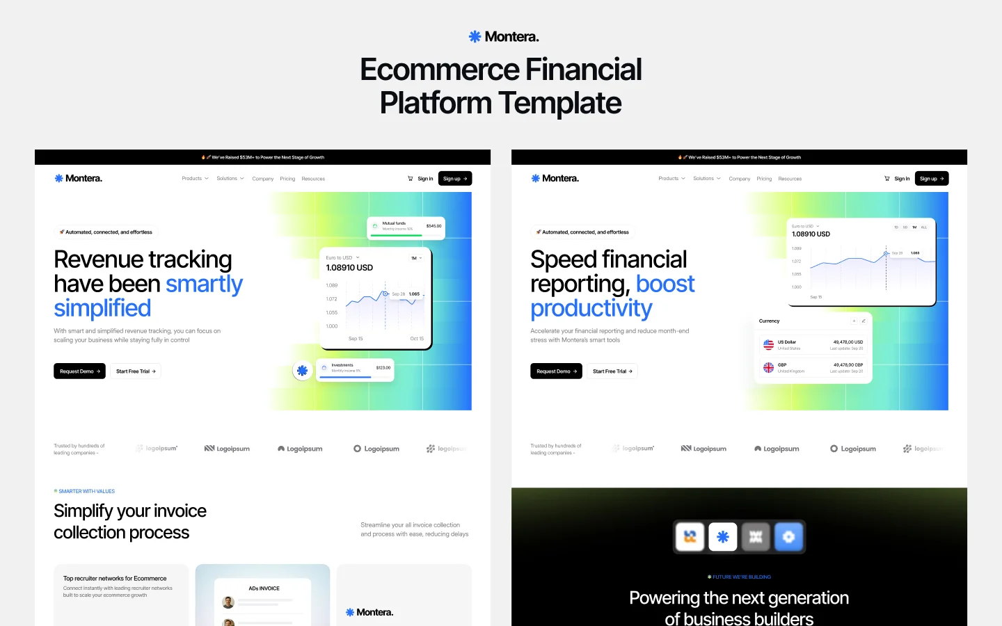 Mmontera is a modern Finance SaaS Webflow template built for fintech startups, payment platforms, and financial software. Present features, pricing, security, and integrations with a clean, conversion-focused design.