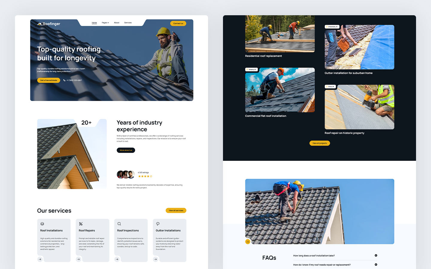 Roofinger is crafted for roofing contractors, residential roofing services, commercial roofing companies, and industrial roofing experts. It includes essential features like service pages, project portfolios, pricing plans, and contact forms, ensuring your business can easily connect with potential customers.