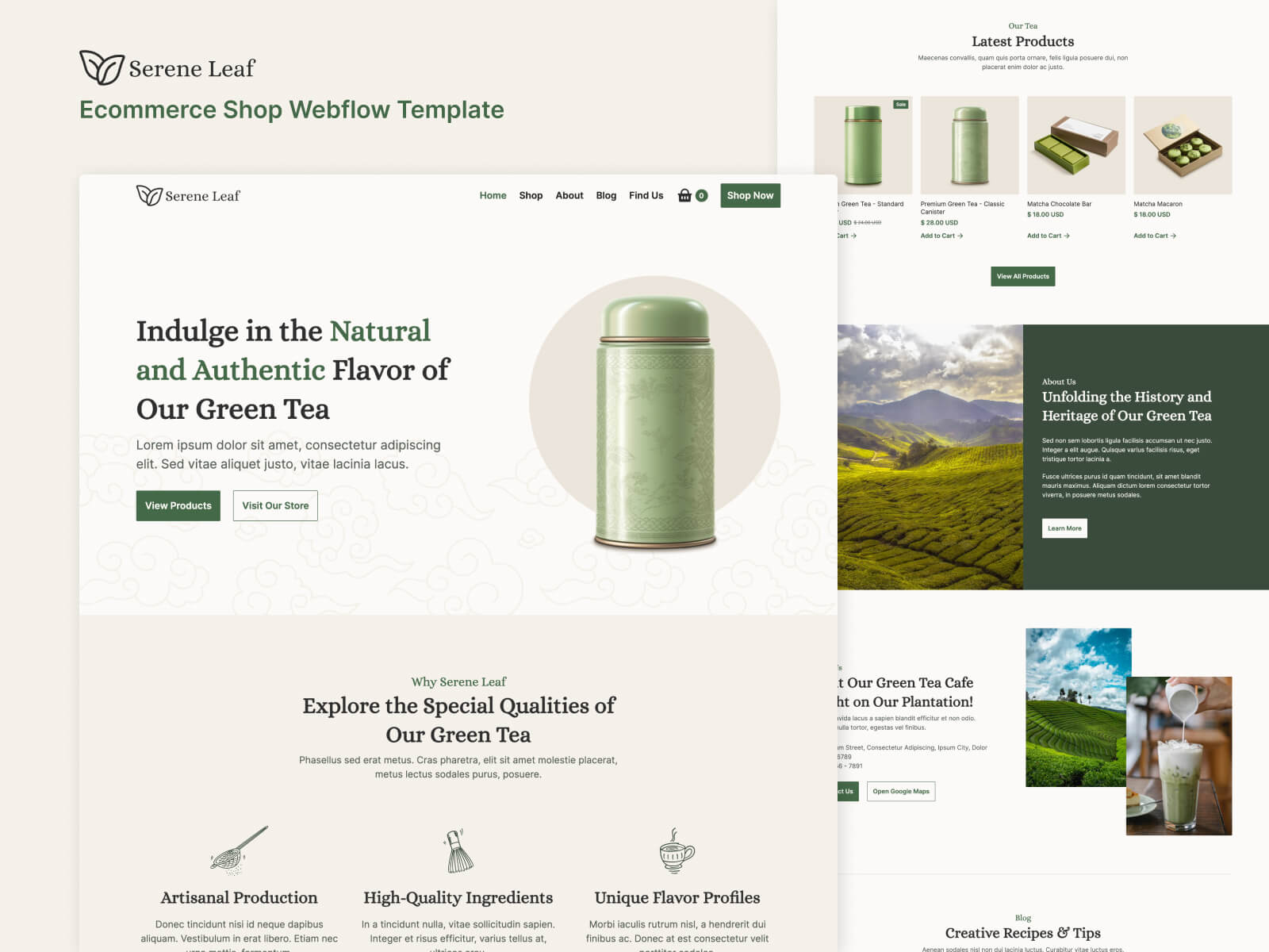 Serene Leaf is a modern and elegant Webflow template designed for ecommerce stores with premium products.
