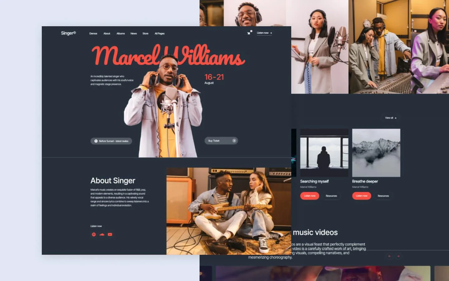 Singer 128 is a professional website Webflow template for music band and singer websites. It also suits perfectly for musician, artist, audio, music producers, recording studio, music artist, music label, record label.