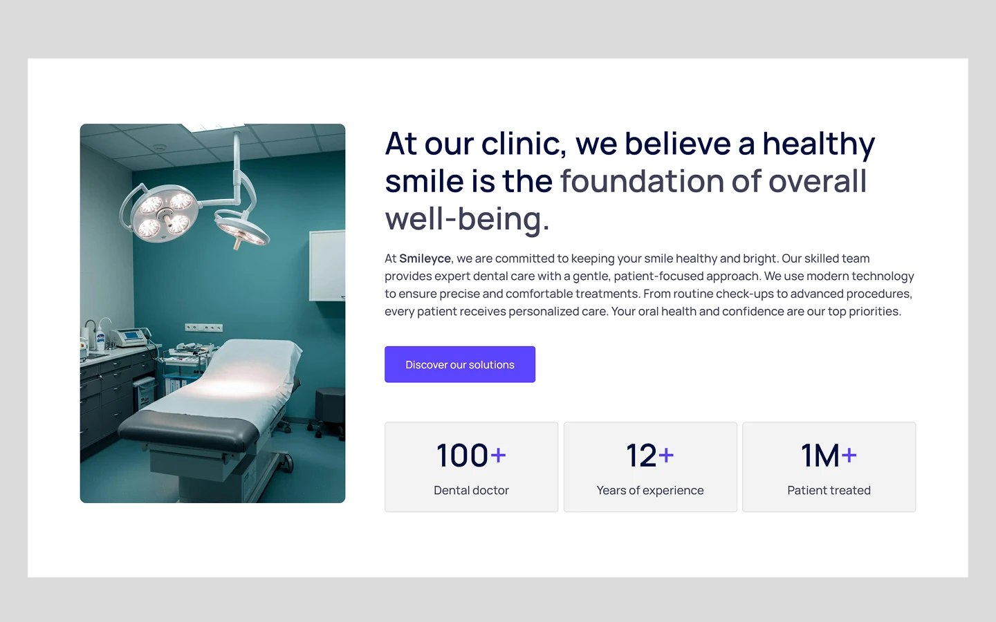The Smileyce Webflow template is a clean, modern, and fully responsive design created specifically for dental clinics and oral care professionals. It provides everything you need to build a trustworthy and professional online presence that attracts and engages patients. With its elegant layout and intuitive structure, Smileyce makes it easy to showcase dental services, highlight your expert team, and share patient testimonials — all while maintaining a polished, high-end look.
