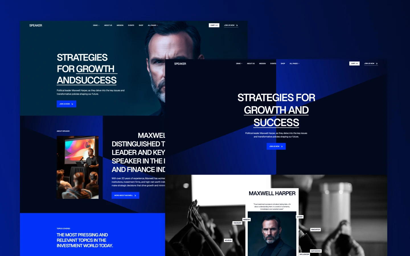 Speaker is a Webflow template for Coaching, Motivational Speaker, Political, Politics, Candidate, Volunteer, Business Coach, Business Coaching, Mentor, Trainer, Tutor, Congress, Event, Events websites.