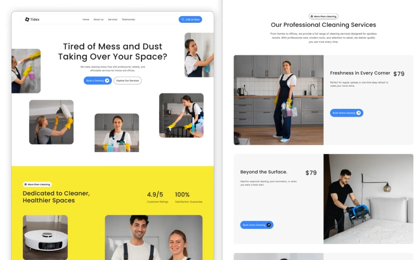 Tidex is a clean and modern Webflow template designed specifically for home services and maintenance companies. Its professional visual style, balanced spacing, and clear content hierarchy help businesses present their services with clarity and confidence.