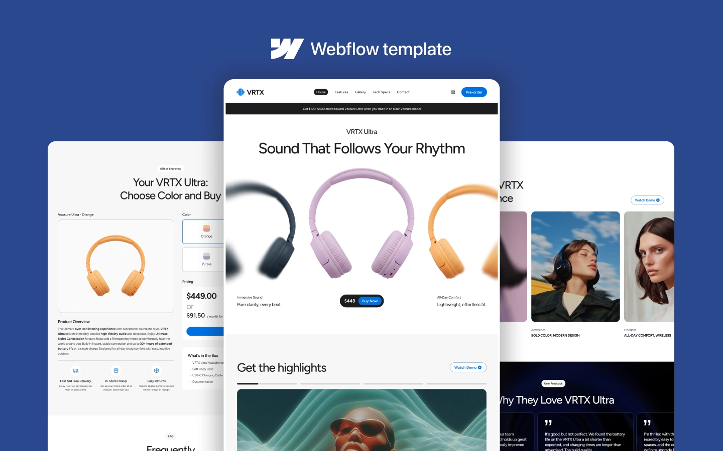 VRTX A minimal and modern Webflow landing page template built for marketers to showcase a single product. Featuring smooth interactions, product highlights, gallery, and testimonials — designed to convert visitors into customers effortlessly.
