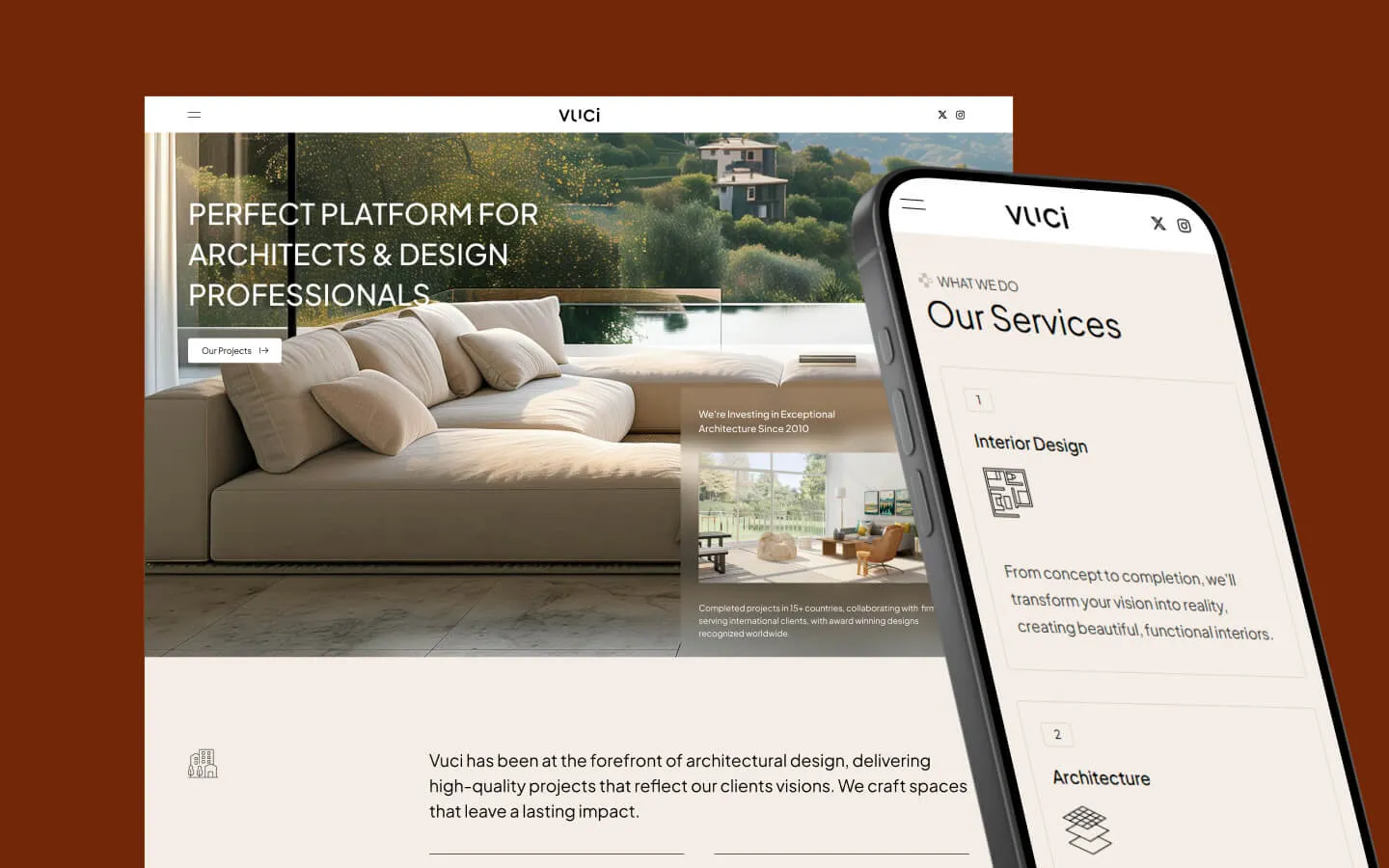 Vuci is the ideal Webflow template for showcasing creativity in architectural agencies, interior design studios, architect portfolios, construction businesses, decor firms, and landscape design companies.