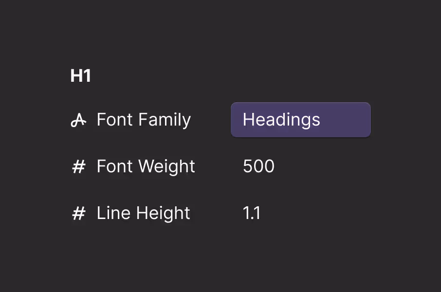 - Typography - Using variables for all type settings creates a single source of truth for both semantic styles (<h1>) and class-based styles (.h1).
