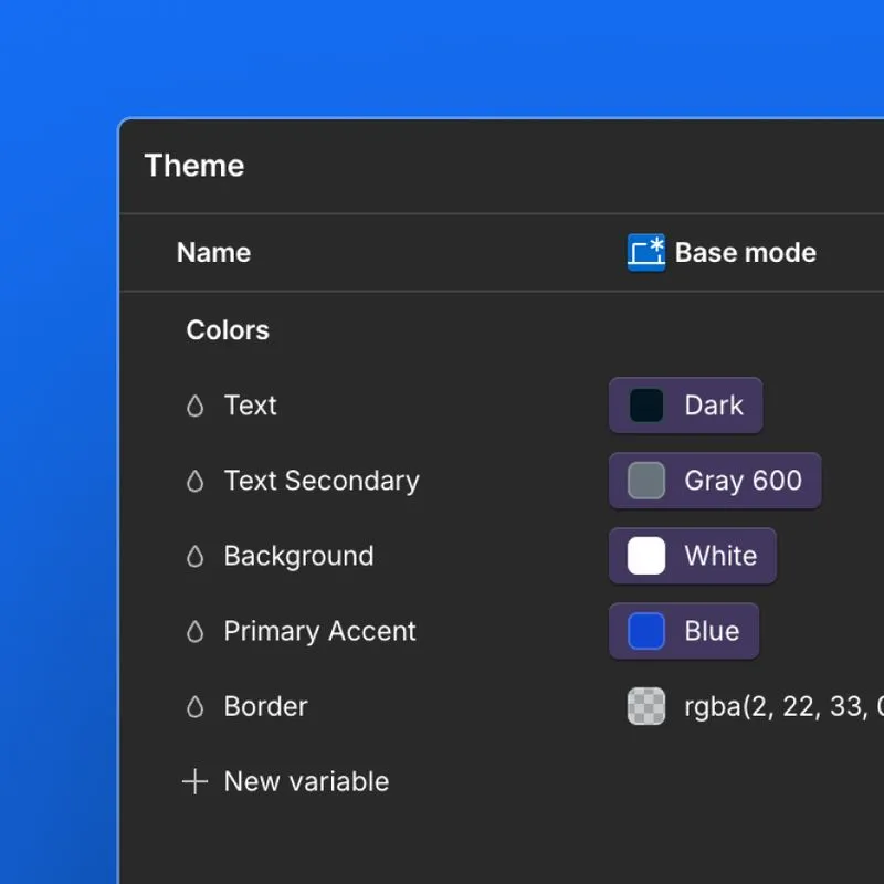 Semantics are variables that have a specific purpose and context. Each semantic variable is named to describe how it should be used, like “Primary Text” or “Card Border”, rather than the visual appearance of their values. These variables can use a raw value, but when multiple semantic variables have the same value, they should reference a shared primitive variable.