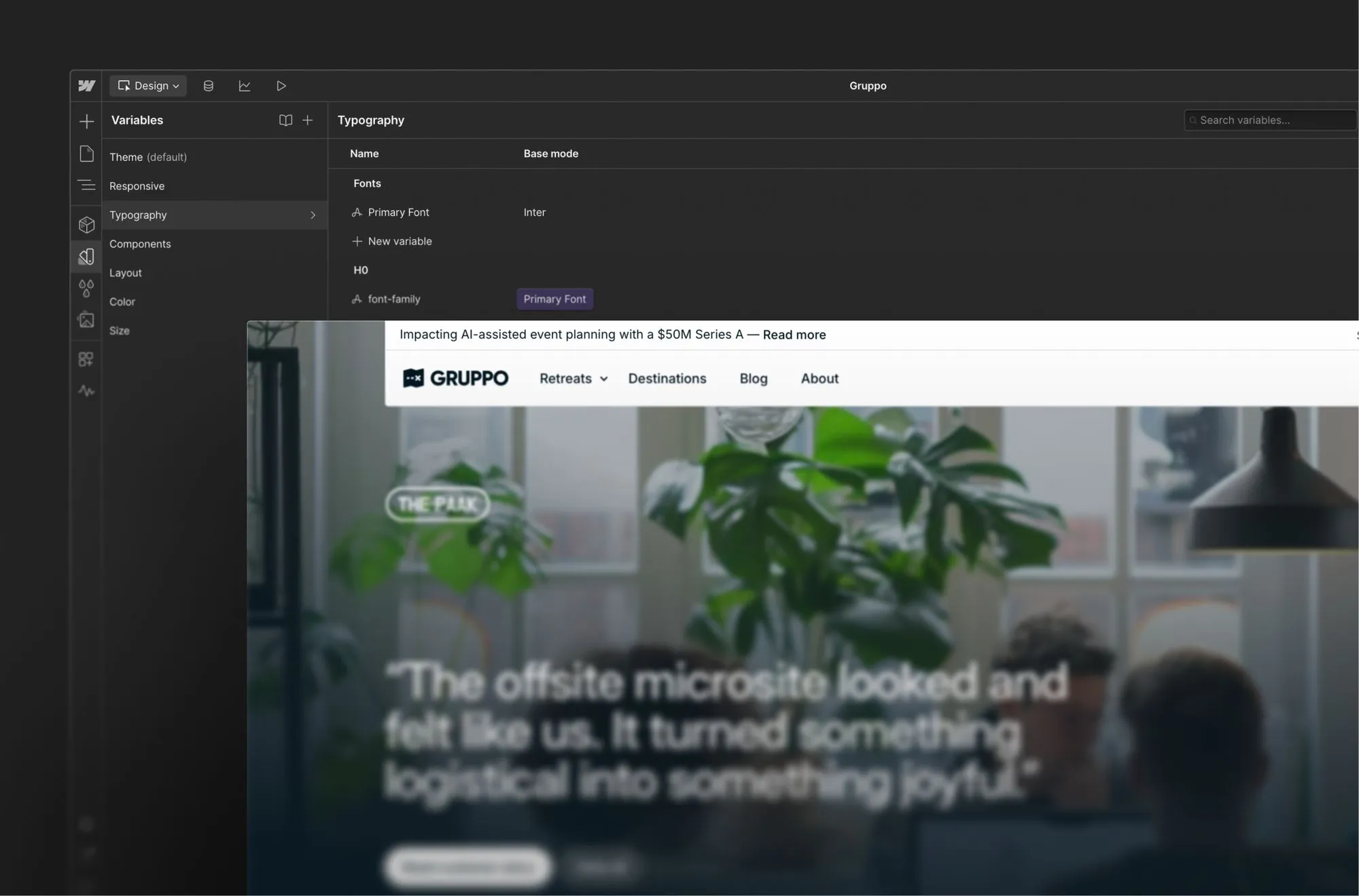 Gruppo can change the typography across their entire site by updating the “Primary Font” field in the variables panel.