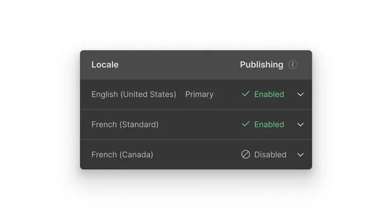 New locales can remain in draft until you’re ready to launch. Once publishing is enabled, that locale becomes live across your site.
